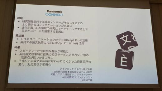 汎用LLMとの性能面での直接比較は避けつつも、DeepLの優位性として具体的な事例に言及した。パナソニック コネクトでは、生成AIで論文を英訳した際には修正箇所がわかりにくかったが、DeepLでは変更点や対応関係が明確に表示され、効率的な校正が可能になった。従来の校正サービスと比較すると5〜6倍の改善点を発見できるようになったという。