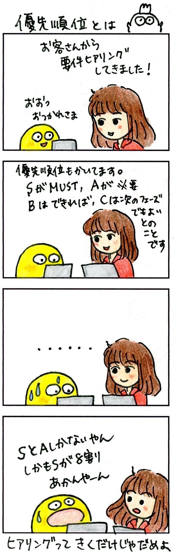 などの優先順位があります。ところが、新人さんのヒアリング一覧はS(絶対必要)とA(必要)しか見当たらない上、Sが8割を占めています。