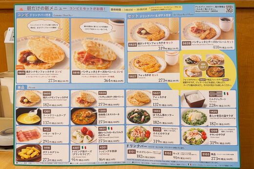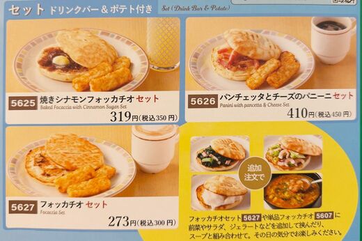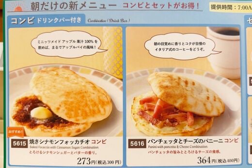 お得な組み合わせメニューとしては、パンとドリンクバーを組み合わせたコンビが2種、コンビにハッシュポテトをプラスしたセットが3種。