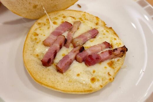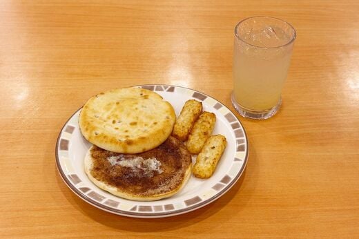 元の価格が税込300円と激安なので、税込50円の半熟卵を挟んで食べても350円、税込150円のコーンクリームスープにひたして食べても450円。