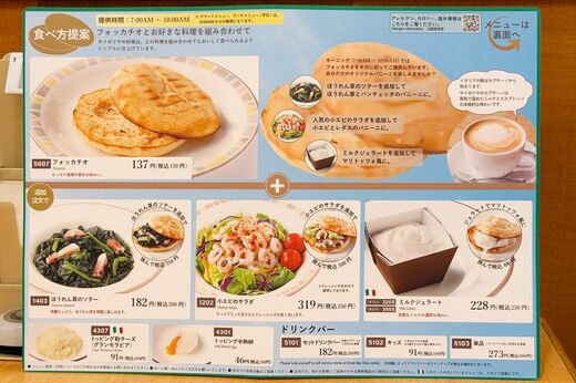 ですが、メニューの裏には、小エビのサラダをサンドして野菜たっぷりのパニーニにしたり、ミルクジェラートをサンドしてマリトッツォ風にするアレンジメニューも提案されていました。