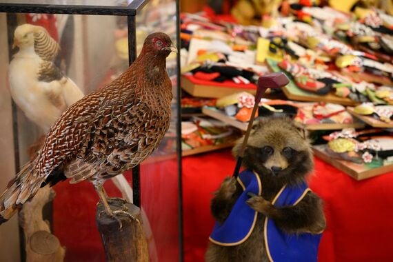人形の中で最も多くの数を占めるのは、ひな人形と五月人形。加えて兜、破魔弓、羽子板、こいのぼりの布部分といった、節句のお祝い関連のものが多い。さらに、ぬいぐるみ、一体ものの日本人形やフランス人形、陶器の置物などが並ぶ。よく見ると、キジやタヌキの剥製もあって驚く。