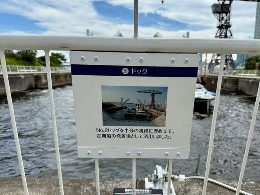 付近をよく見ると「ドック No.2ドッグを半分の規模に埋め立て、定期船の発着場として活用しました。」と書かれたプレートが付けられている。「ドック」とは、船の建造や修理などを行うための設備のこと。