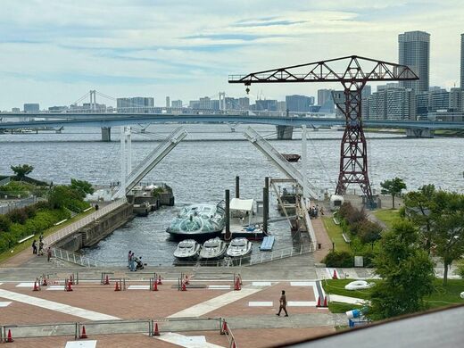 「ドック広場」には、浅草行きの水上バス乗り場も設けられている。ちょうど水上バスの出発時間であったため船のような乗り物がやって来て、子連れファミリーなどが乗り込む様子が見られた。