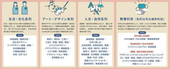 だからこそ、自ら学校に行きたくなるような、魅力ある学びを取りそろえている。同校では文科省が定めた必履修科目や学校が定める学校必履修科目のほかに、多彩な自由選択科目を用意。自由選択科目として①生活・文化系列、②アート・デザイン系列、③人文・自然系列の3系列をそろえたほか、興味関心、進路希望に応じて選べる教養科目もある。