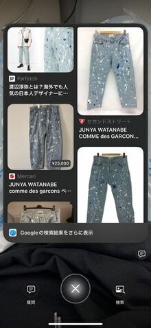 筆者も、試しに自分がはいているデニムパンツをVisual Intelligenceで検索してみたところ、まったく同じブランドの同じ商品が販売されているメルカリのページがヒットした。