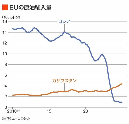 実際、EUの原油輸入量に関して、ロシアからとカザフスタンからで比較をすると、2023年中頃を境にカザフスタンからの輸入量がロシアを上回っている。