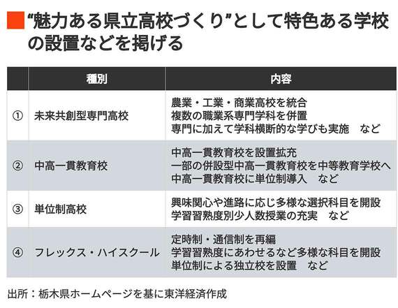 こうした中、栃木県では2013年度から県立高校の再編計画を実施。2024年度から第三期県立高校再編計画(以下、再編計画)を進めている。再編計画では、全日制高校の規模と配置の適正化とともに、“魅力ある県立高校づくり”として①未来共創型専門高校、②中高一貫教育校、③単位制高校、④フレックス・ハイスクールといった特色ある学校の設置などを掲げている。