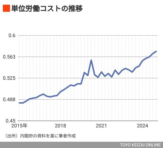 労働生産性が上昇すれば、1単位の最終生産物を作るために必要とされる賃金支払額は減少するから、単位労働コストは低下する。それに対して、労働生産性が下落すれば、単位労働コストは上昇する。