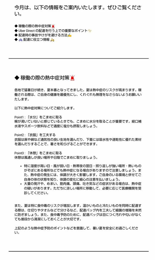 ウーバーでは2024年7月に「稼働の際の熱中症対策」について書かれたメールが配信されている(おそらく今年も7月頃に配信されるのだろう)。具体的には、「『水分』をこまめに取る」「『衣服』を工夫する」「『休憩』をこまめに取る」という内容だった。