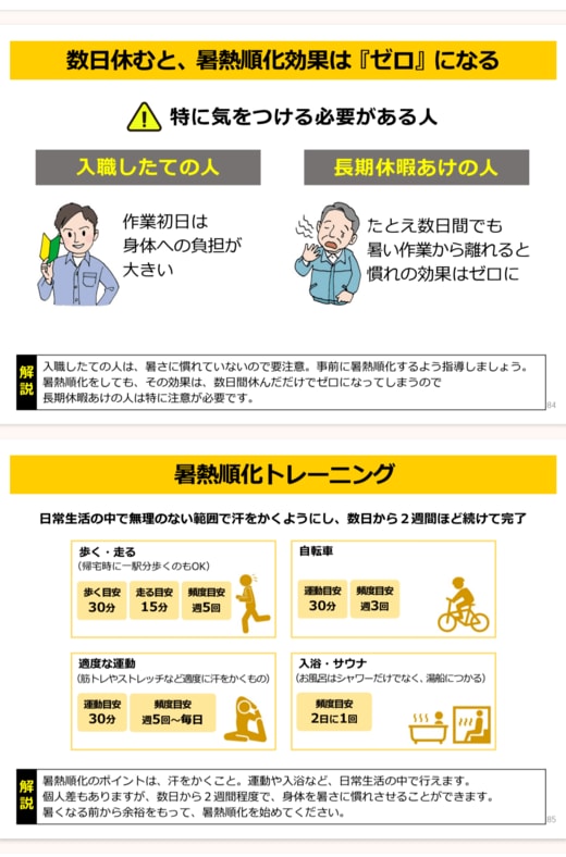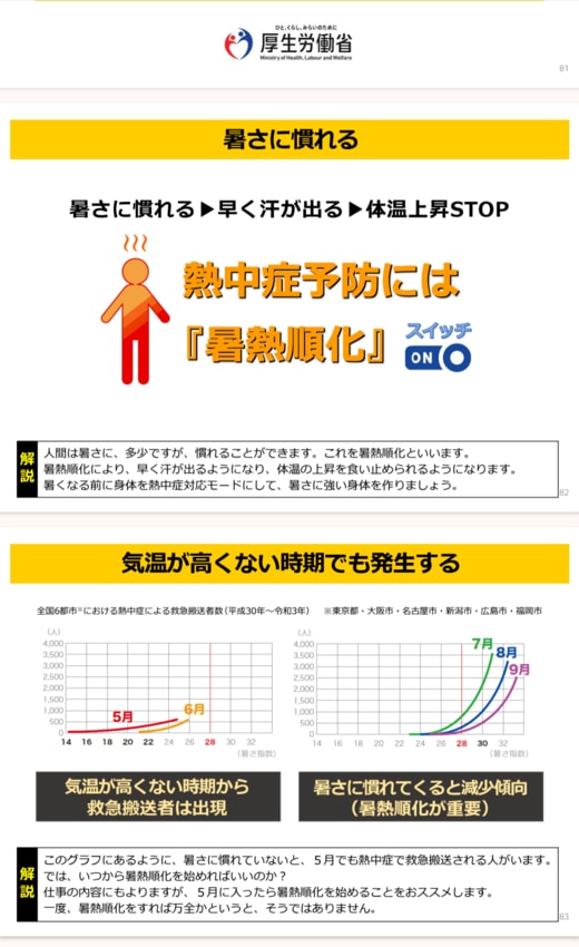 昭和の根性論のようにも聞こえるが、暑熱順化が熱中症予防に有効であることは、厚生労働省も公式に認めている(厚労省の公式YouTubeチャンネルでは「職場における熱中症予防」として、暑熱順化についての動画が配信されている)。