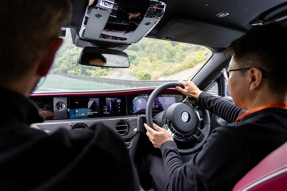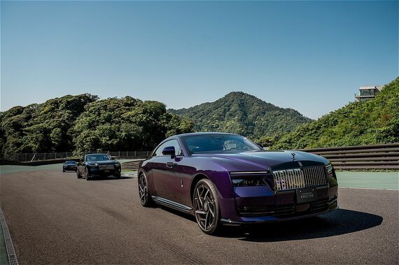 最初にハンドルを握ったのはBEVモデル「ブラック・バッジ・スペクター」(5614万円~)。コースイン直後、いきなり急な下り勾配と対峙する。試乗時は前日からの雨が降り続き、コースには小さな雨の川が何本も流れているわかりやすく緊張する場面。しかも、自身は初THE MAGARIGAWA CLUBで、コースレイアウトすら頭に入っていない。