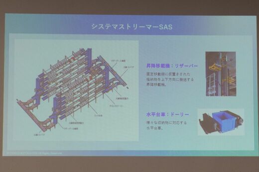 SASの基本構造は、垂直方向に昇降するリフター(リザーバー)と、水平方向に荷物を搬送するシャトル台車(ドーリー)の組み合わせだ。この垂直・水平の独立制御により、業界最速クラスの入出庫を実現している。