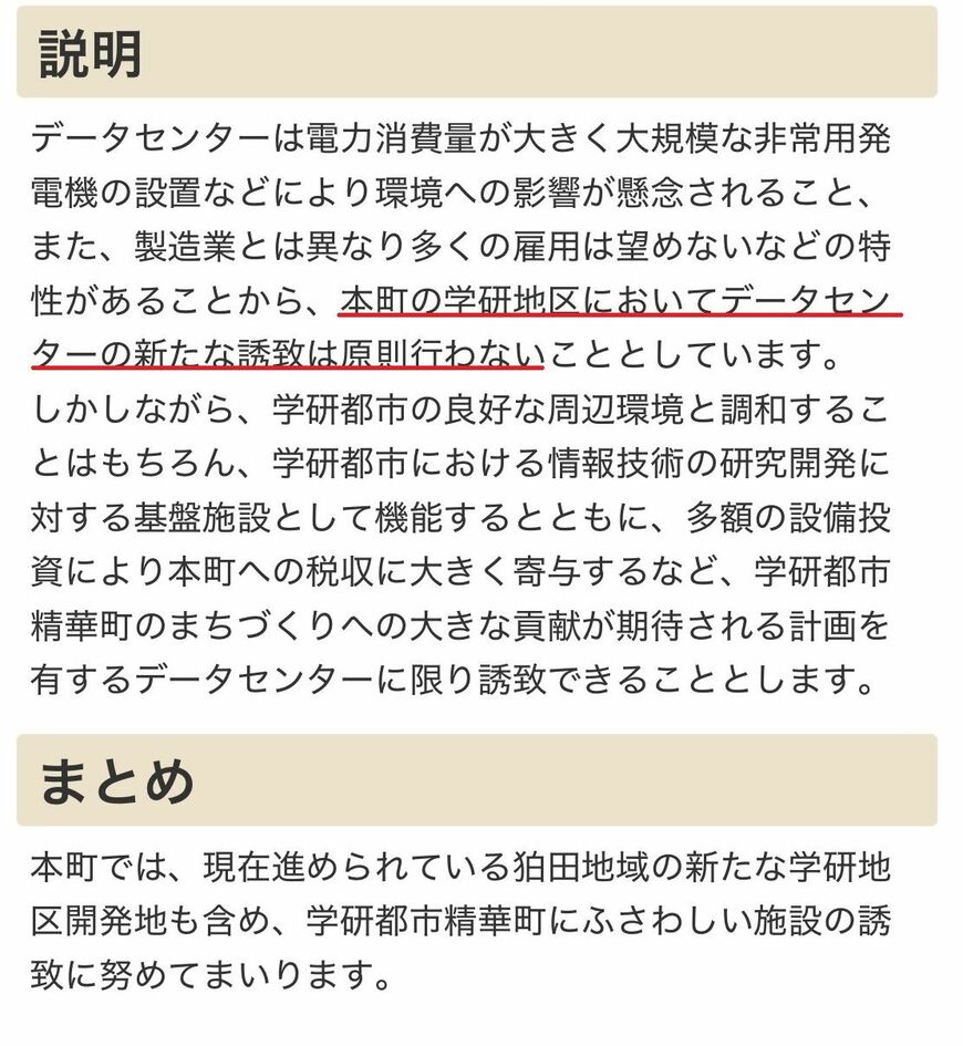 データセンターの新たな誘致は原則行わないと宣言した京都府精華町の説明。傍線は編集部(画像:京都府精華町のホームページより)