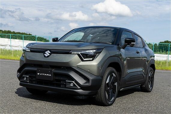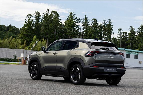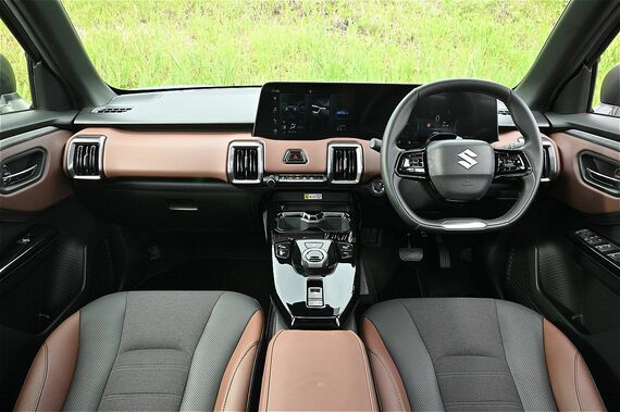 “BEVらしさ”を過剰に主張していない点も筆者には好意的に映った。いわゆる環境対策車を想起させるため、淡いブルーやグリーンを各部に配したモデルはいくつか残るが、eビターラはそういったアースカラーに頼ることなく終始一貫「スズキデザイン」で勝負した。唯一、eビターラのエンブレムの「e」がライトブルー基調だが主張はごく控えめだ。