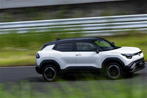 じんわりアクセルを踏み込み微速から味わってみたが、この時点でeビターラがどこに力を入れて開発されたのか伝わってきた。具体的には、コンパクトクラス(スズキのラインアップ上はミドルクラス)相当のまとまり感あるボディサイズながら、もっとボディサイズの大きなクルマに乗っているような落ち着きがあり、乗り味もしっとりしている。わかりやすく上質だ。