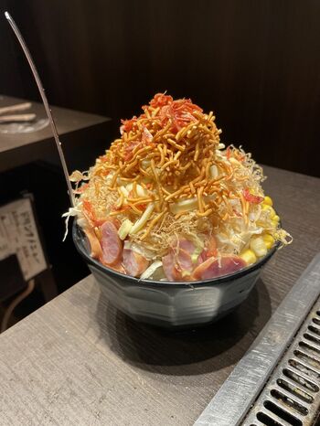 人気メニューの「おたけスペシャル(1650円)」を注文した。生海老、コーン、ウインナー、チーズ、ベビースターラーメンがてんこ盛りの逸品である。