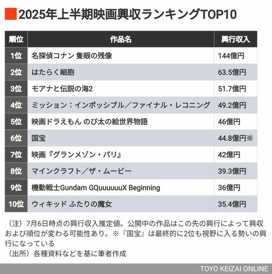 昨年はTOP5のうち邦画アニメが4作を占めたが、今年は2作のみだ。上半期は大ヒット作の数が減ってはいるが、下半期には話題作が控えている。