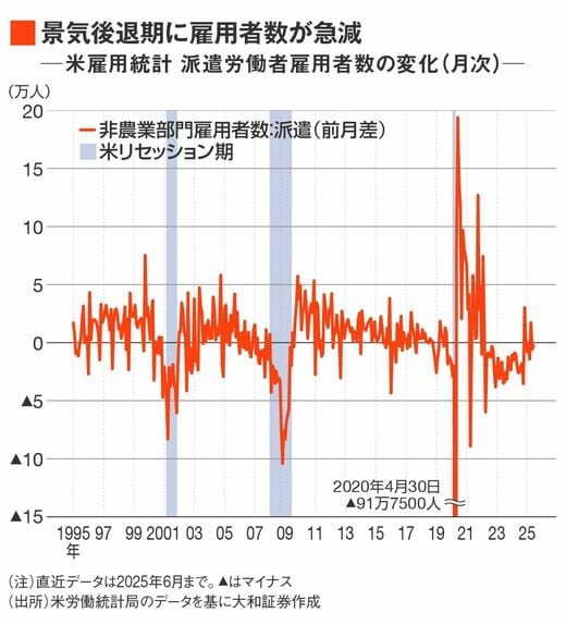 下図では雇用統計の詳細項目である、派遣労働者雇用者数の変化を示している。同統計は、アメリカ労働市場の環境変化を早期に知らせてくれる、いわば“炭鉱のカナリア”と捉えられる。