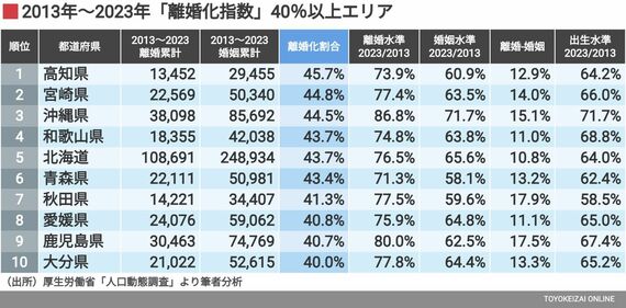 そのような中で、離婚化指数が40%以上となっているのは高知、宮崎、沖縄、和歌山、北海道、青森、秋田、愛媛、鹿児島、大分の10道県となり、前回よりも1エリア増加(大分が追加)となりました。ちなみに、離婚化指数ワースト10の順位は不動です。