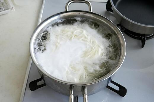 氷水と沸騰した湯を準備し、袋の表示時間を参考にそうめんをゆでます。そうめんを入れたら弱火に落とすのがセオリー。吹きこぼれを防ぐことができます。