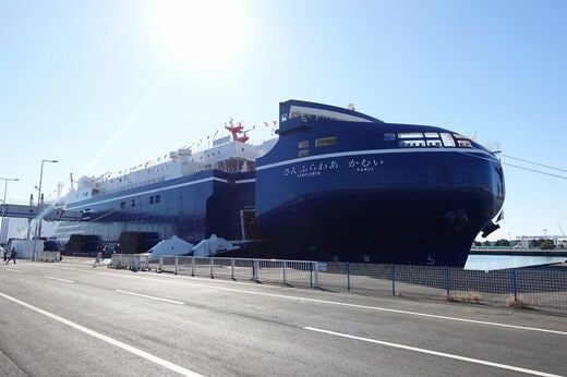 関東だと長距離フェリーだとほとんどの船が茨城・大洗港に集中していて、クルマだと東京から100km少々、電車・バスを乗り継いでも3時間程度はかかる。「さんふらわあ」も東京・有明港発だと、房総半島を船で回り込む時間がかかりすぎて大洗港に発着地点を移した経緯があり、都心に発着できないのはやむを得ない。