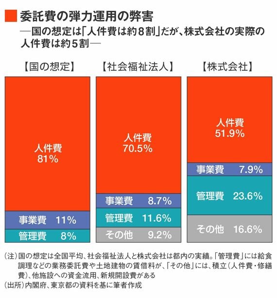 多くは人件費が流用されるが、東京都の調査では、実際に支出される人件費比率は社会福祉法人で約7割、株式会社で約5割だった。この調査は過去のものだが、例年似たような支出の傾向がある。