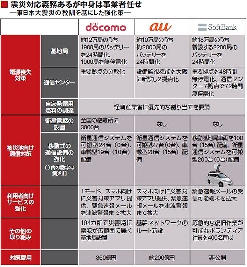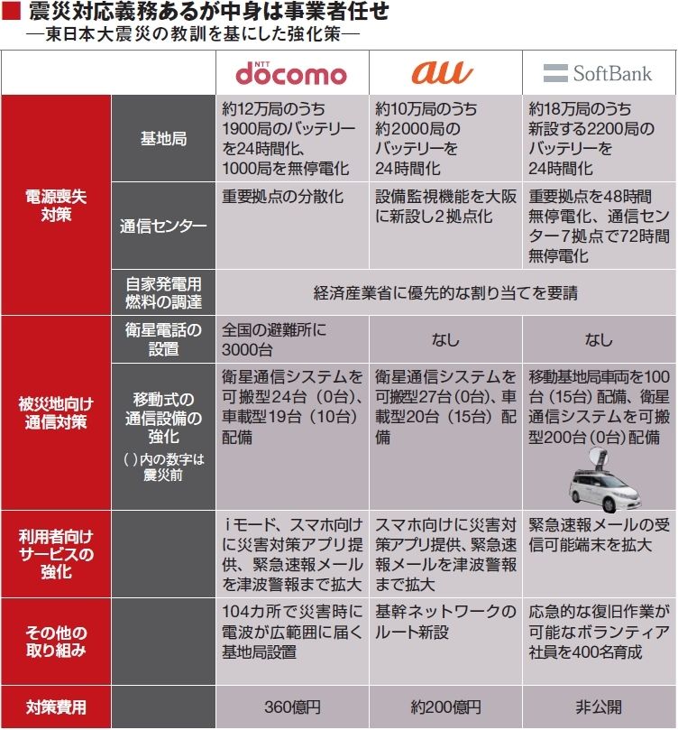 通信事業者は電気通信事業法により、災害時の通信手段の確保が義務づけられており、その責任は大きい。東日本大震災での教訓を基に携帯3社とも対策に乗り出している。