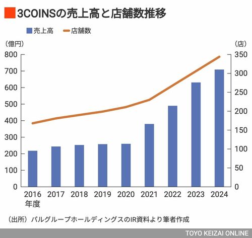 実際、売上高、店舗数の推移をみても、右肩上がりで増えている。スリコは上場アパレルのパルグループホールディングスの雑貨部門の一業態であるため、開示情報は限られているのだが、売り上げを伸ばしつつ、収益も拡大していることはうかがえる。