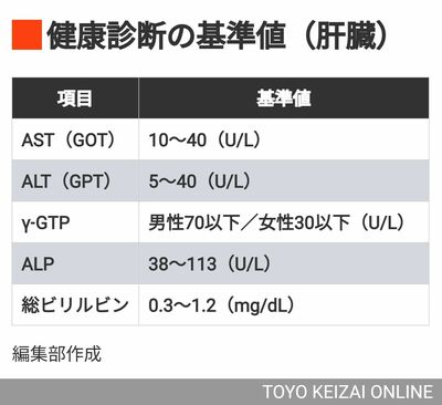 ALPは胆汁の流れが滞ると上昇しますが、骨の病気でも上がることがあるため、単独では診断が難しい項目です。総ビリルビンは黄疸の有無や胆道系の障害を反映します(※外部配信先では基準値を閲覧できない場合があります。その際は東洋経済オンライン内でお読みください)。