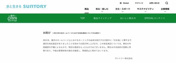 同年、サントリーが販売する韓国焼酎「鏡月グリーン」の商品紹介のサイトに、日本海の名称に韓国や北朝鮮が主張する「東海」と表記されていたことで批判が殺到するという事案も起こった。批判を受けてサントリーはページを削除して謝罪を行ったが、今度は韓国側から批判を浴びる結果となってしまった。