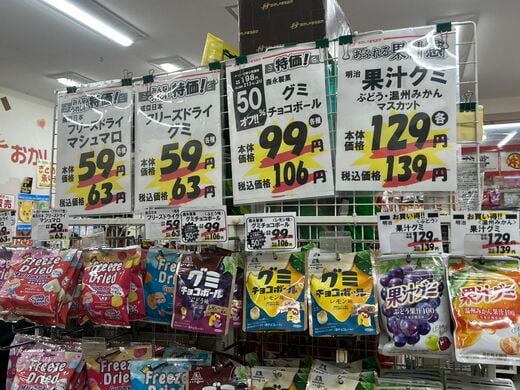 道行く人がつい足を止めて見ていたのが、店頭にあるディスカウント商品だ。筆者の来訪時は、『コイケヤ ピュアポテト』が47%オフ、『東ハト 七夕キャラメルコーン』が40%オフなど、ポップとともに特売品が並ぶ。