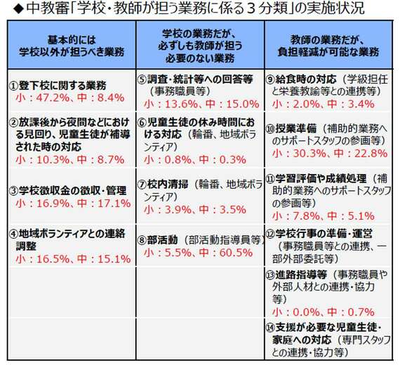 ほか14業務が例示されていて、細かく解説すればいろいろとあるが、かつて注目された「事業仕分け」の発想に近い。本当に学校が担う必要があるのかどうか、あるいは教員以外の人にお願いできないだろうか(外部委託や分業)、もう少し効率化できる余地があるのではないか。そうした視点で見直し案を提案している。だが、次の表の赤字のとおり、この3分類の学校実施率は決して高いとは言えない。