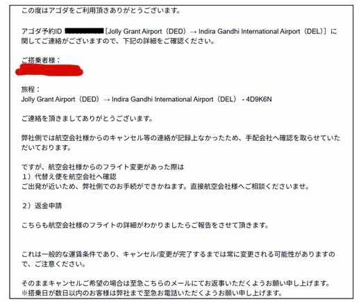 インドの国内線でフライトの3日前、航空会社から「やむをえない事情によりフライトがキャンセルされました」とメールが来た。だがアゴダの予約ページはステータスが変わっていない。