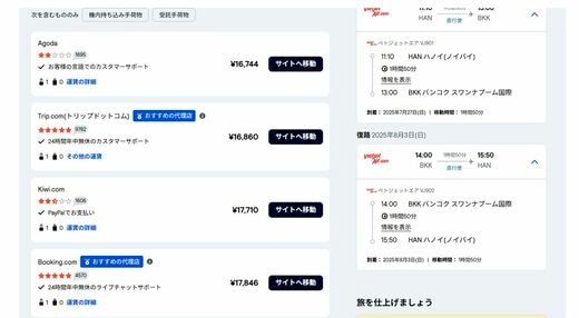 航空券比較サイトで価格をチェックすると、アゴダ、Trip.com、Booking.comのうち、アゴダが最も安いことが多い。だが、利用者のレビュースコアもアゴダが飛び抜けて低いので、数百円の差ならTrip.comを利用してきた。