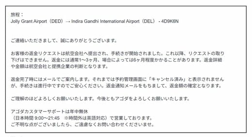 アゴダのカスタマーサポートに問い合わせフォームから尋ねたところ、当日夕方、「フライトキャンセルの連絡の記録がない」と返信があり、翌日、「航空会社からのキャンセルの通知の画面を送ってほしい」と依頼メールが来た。