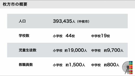 枚方市は、大阪府の京都寄りの場所にある人口40万人弱の中核市。公立の小学校は44校、中学校は19校ある。同市はいわゆる大阪のベッドタウン的な都市で子育て世代が多いこともあり、非常に教育に力を入れている。GIGAスクール構想第1期では、市長の強い意向で「サクサク動く、直感的、どこでも使える」ということでiPad(第7世代)のセルラーモデルを3万5000台導入した。第7回日本ICT教育アワードでデジタル大臣賞を受賞し、デジタル副大臣が視察に来たほど成功事例として認知されている自治体だ。