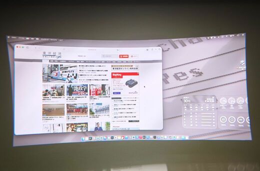 画角21:9のワイド画面で、PCの画像が空中に表示される。写真は撮影の関係で多少歪んでいるが、一般的なノートPC(13インチクラス)の数倍くらい大きな画面を表示して使える……と思ってもらえばいい。画面が広くなって作業がしやすくなるだけでなく、「他人に中身を見られることがない」というメリットもある。