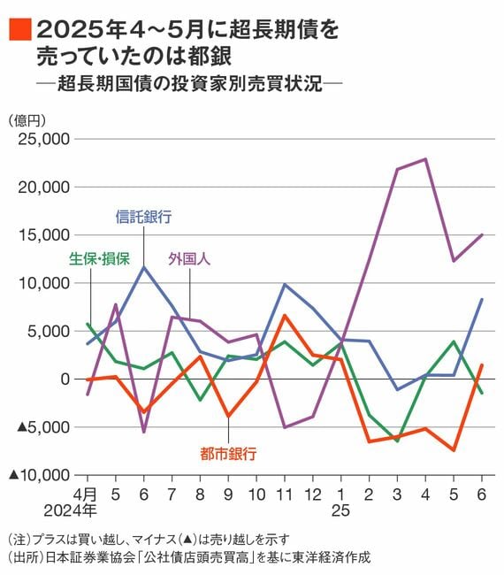 日本証券業協会の統計データを見ると、この春に超長期債を売り越していたのは都銀だ。都銀が5000億円を超える規模で4カ月ほど売り越している。