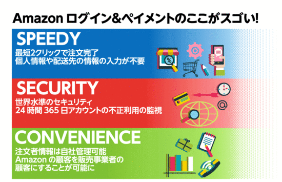 これまでAmazonでは、チケット購入や出前サービスを扱ってきませんでした。しかし、Amazonログイン&ペイメントにより、これらのサービスもAmazonのユーザーに提供できるようになりました。Amazonが重視する「品ぞろえ」が拡充される一方で、販売事業者様も、お客様に安心で便利なお買い物プロセスを提供し、Amazonのお客様を自社サイトの新しいお客様にすることができ、注文成約率も上げることができる。これこそ、まさにWin-Winの関係と言えるでしょう。