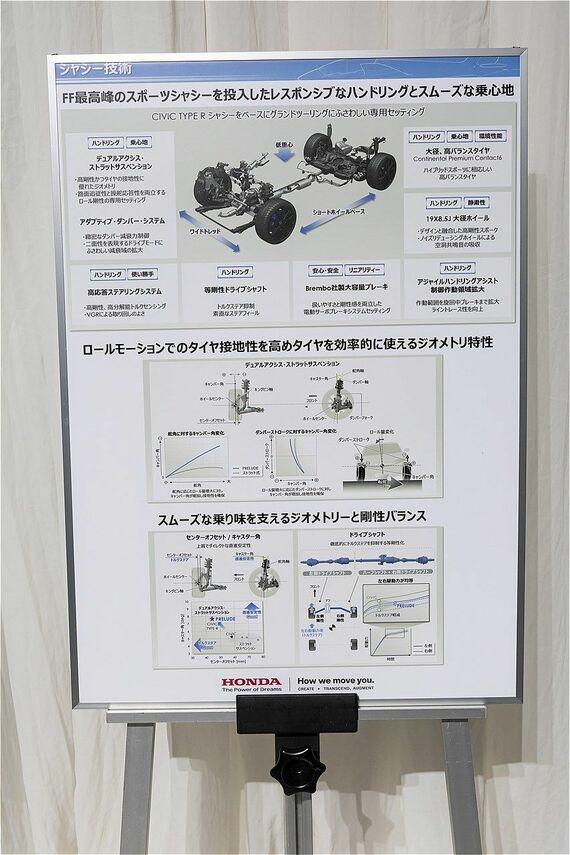 また、シャシーは、スポーツカーの「シビック タイプR」をベースに、長距離移動などでも快適なグランドツアラー的な味付けの専用セッティングを実施しているという。さらにサスペンションは、これもシビック タイプRに使われる「アクティブ・ダンパー・システム」を採用。走行状況や路面状態に応じて4輪のダンパー減衰力を独立制御する電子制御式サスペンションだ。