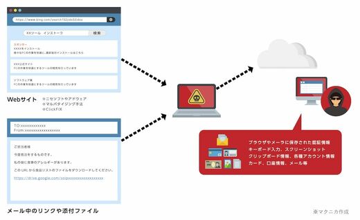 Infostealerの感染源は、受信メール内の添付ファイルやリンク先にあるファイルなどをはじめ、危険なWebサイトからダウンロードしたファイル、後述する「ClickFix」と呼ばれる手法を利用したものまで多岐にわたります。ほかにも、著名なゲーム配信プラットフォーム、SNSメッセージ、偽アップデートファイル、海賊版ソフトまで、さまざまな感染ルートが報告されています。