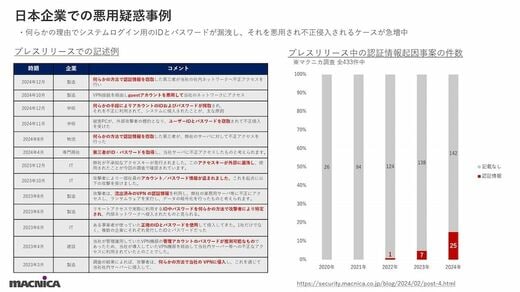 また、Infostealerによるものかは不明ですが、認証情報の漏洩により発生したインシデントは日系企業からも数多く報告されはじめています。2020年以降にプレスリリースを出した433件の日系企業のランサムウェア被害において、2024年には調査全体の約20%で認証情報が悪用されていることが確認できており、この割合は年々増加してきています(マクニカ調査)。