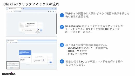 上記のような画面上の操作指示に従う過程で、悪意あるコマンドを被害者自らに実行させ、最終的にInfostealerに感染させるのです。操作を求める口実としては「人間かどうかの確認」以外に、「ウイルス除去」や「PCのエラー解消」「情報閲覧のため」など様々です。