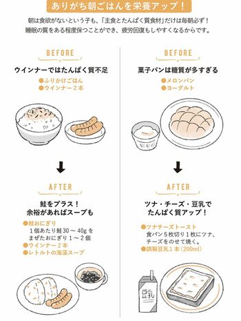 この3つです。焼きそばでも、豚肉やキャベツ、玉ねぎ、にんじんなどの具材をたっぷりと入れる。習い事の関係で夕食が早い場合は、帰宅後に50~80g程度の「おかかおにぎり」などの補食を食べさせてみて。