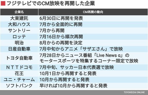 6月25日に、フジテレビの親会社、フジ・メディア・ホールディングスの株主総会が行われて以降、主要企業におけるフジテレビへのCM再開の動きをまとめたのが下表である。