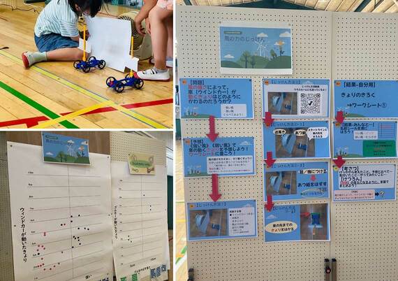 体育館は、「ゴムの力の実験」「風の力の実験」の会場だ。児童が2人1組で、ウインドカーと送風機などを使いながら、風の強さと車が動く距離の関係について実験。入り口に設置された説明ボードやワークシートを確認しながら、まずは結果を予想した。「準備はこれで大丈夫だね」「じゃあ、弱い風と強い風を比べてみよう。最初は弱い風ね」と会話しながら実験を進める姿は真剣そのもの。「あ、止まった! 距離を測ろう」と、出た結果はすぐに記録し、シールを表に貼って仲間と共有していた。