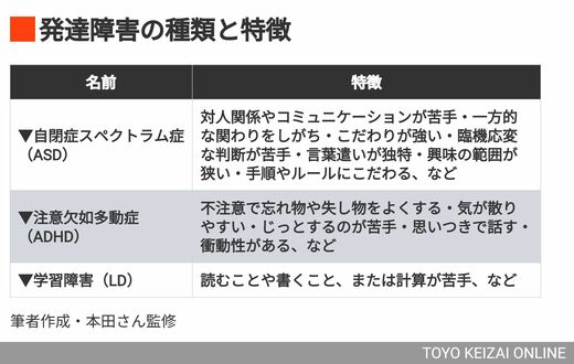 これまで30年以上、発達障害の専門医として診療を続けてきた本田さんはこう話す。発達障害とひとくちに言っても自閉症スペクトラム症、注意欠如多動症などさまざまな診断名があり、それぞれに違う特性がある。