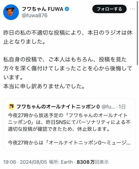 たとえば、「男性の体臭」発言で炎上し、当時の所属事務所を契約解除になったフリーアナウンサーはどうか。こちらも同じく2024年8月上旬に炎上した事案だが、顔や名前を思い出せる人は、どれだけいるだろうか。