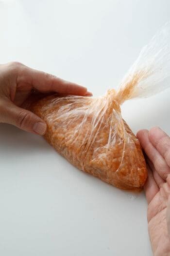 ごはんを袋に入れたら、袋の両端を利用すると、オムライス型に整いやすくなります。